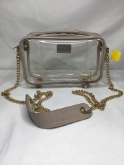 Clear handbag with gold chain and pink strap. Perfect for concerts and sporting events.